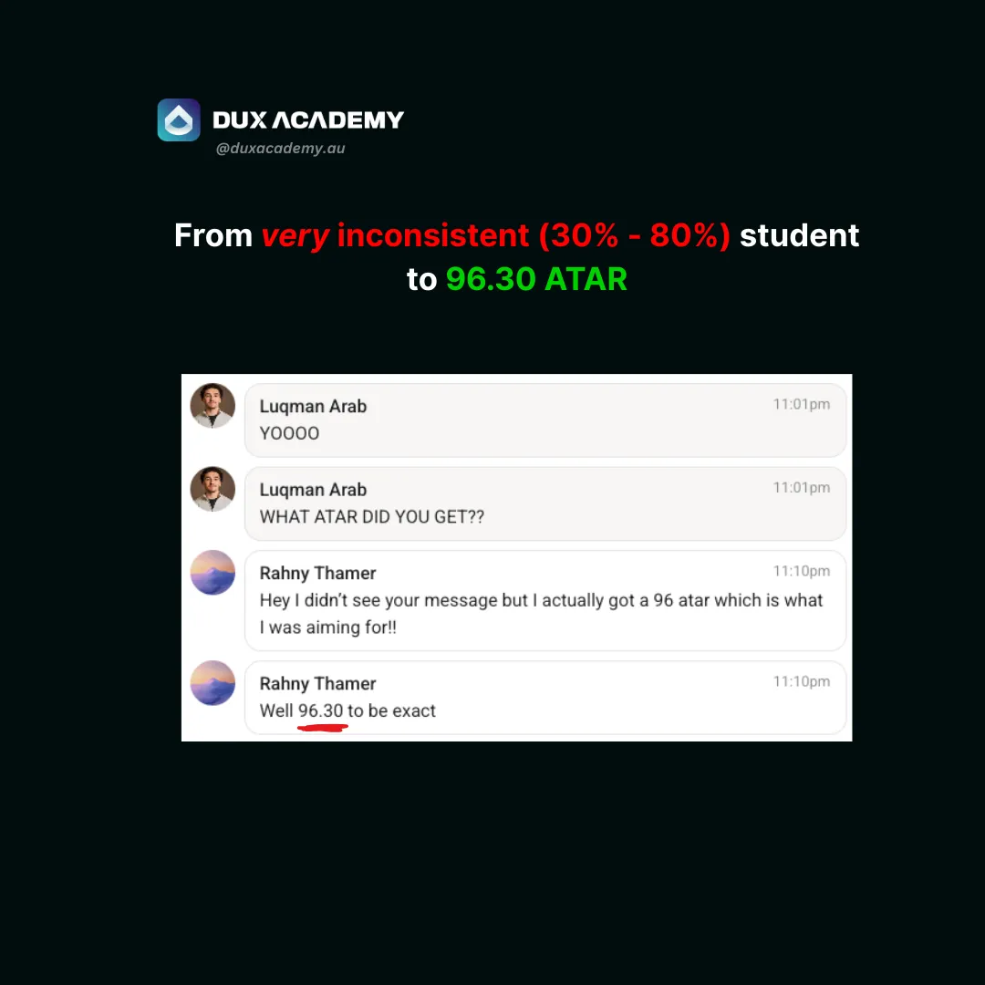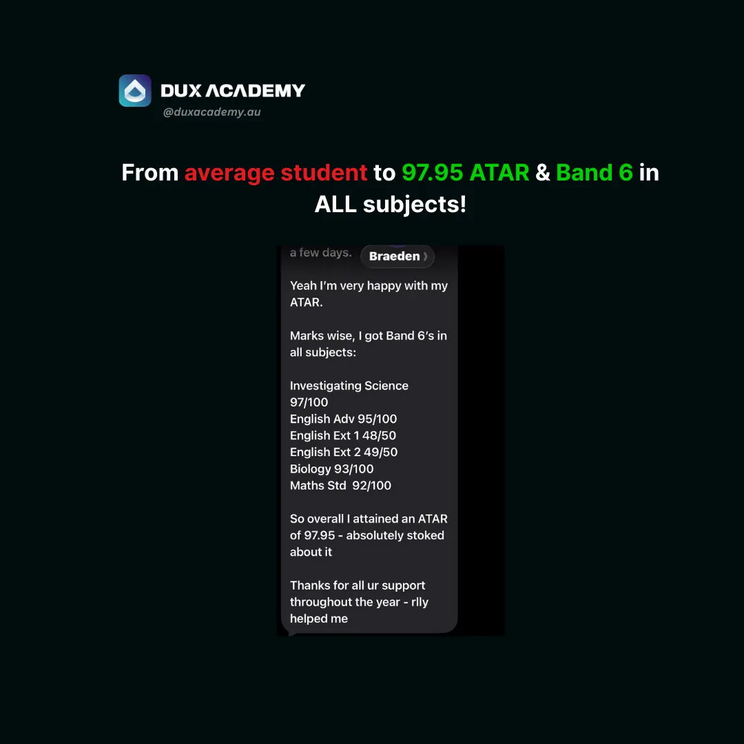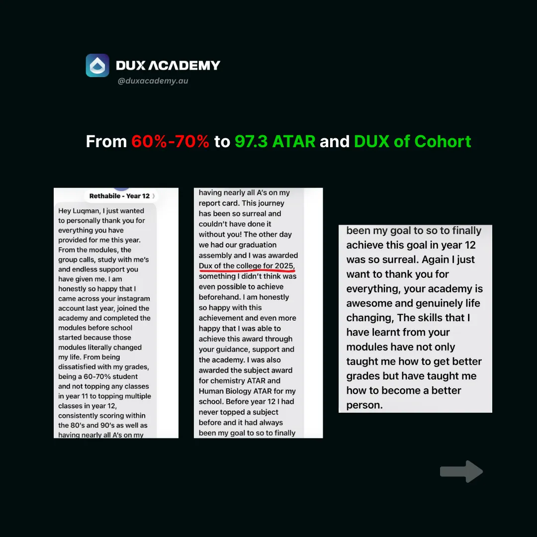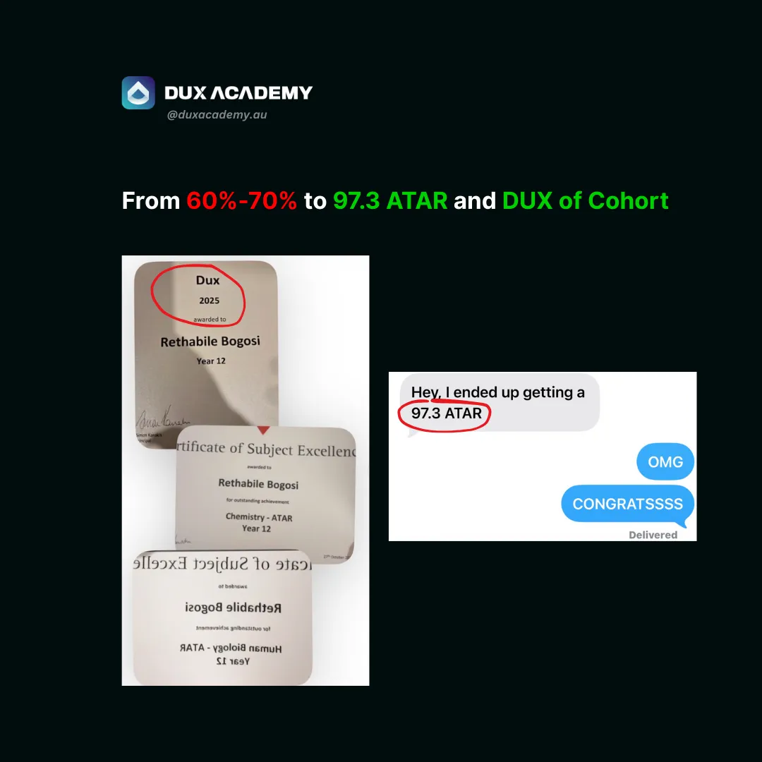DUX Academy is your step-by-step blueprint that covers EVERYTHING you need to make the greatest academic comeback and achieve a 95+ ATAR - regardless of your current grades, school you go to or the subjects you've chosen.