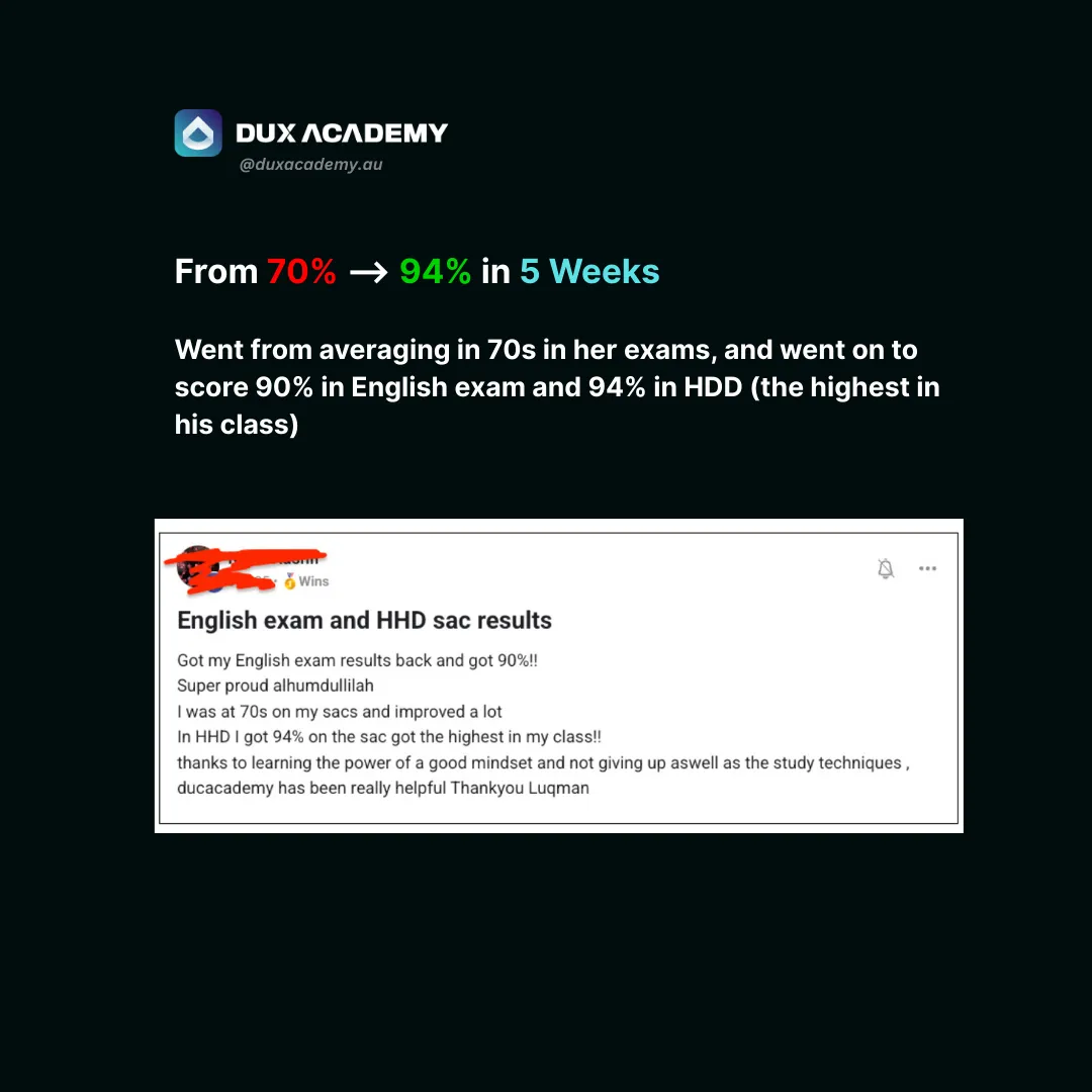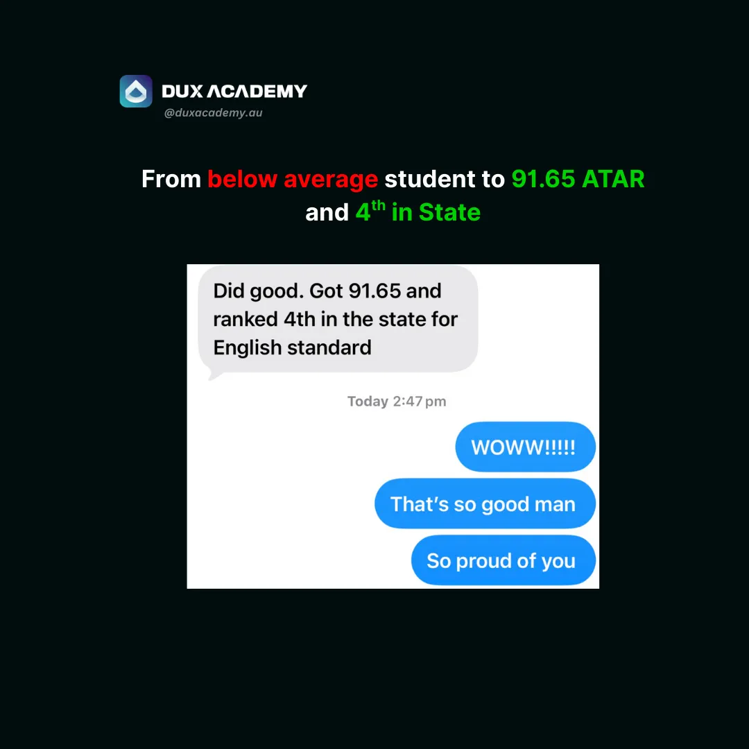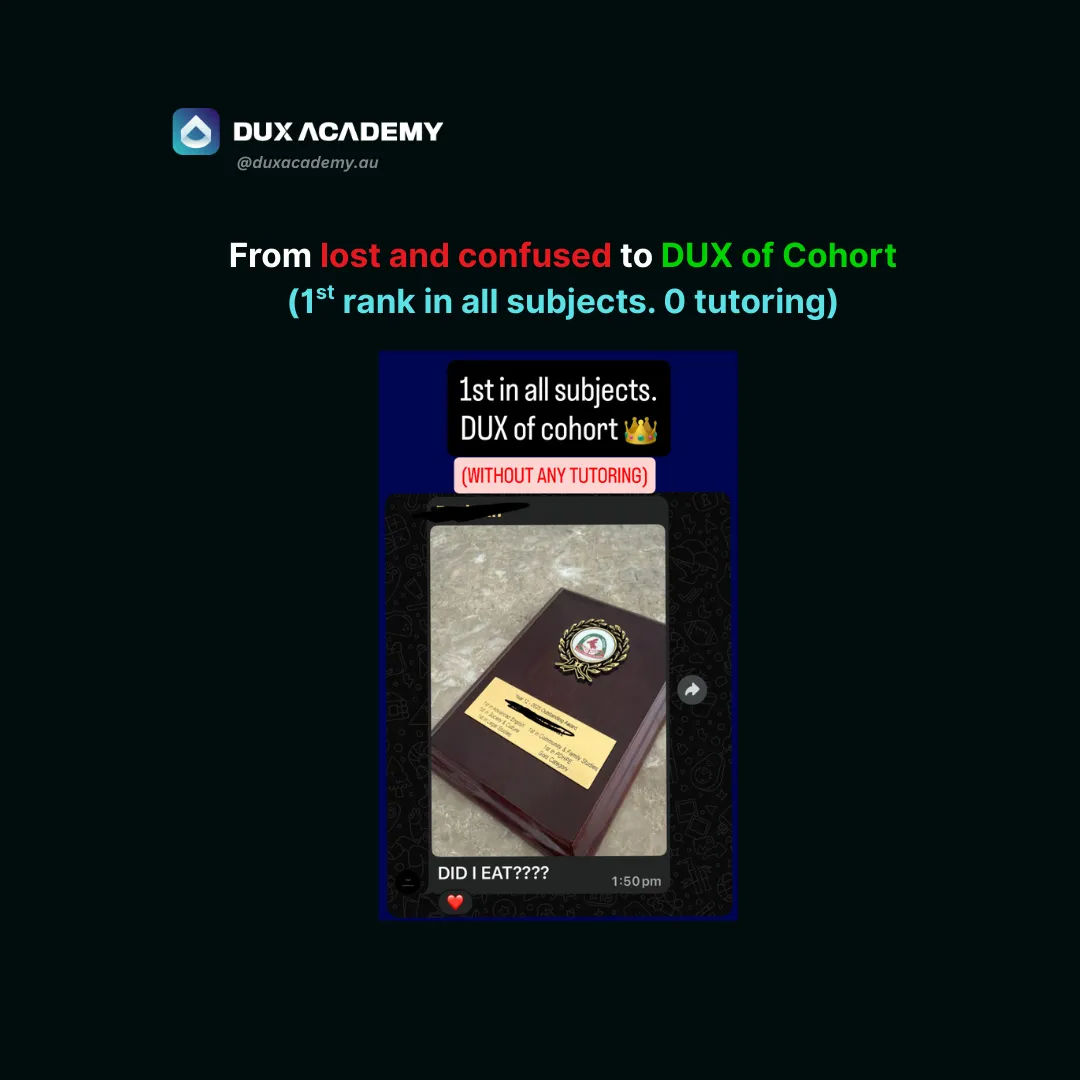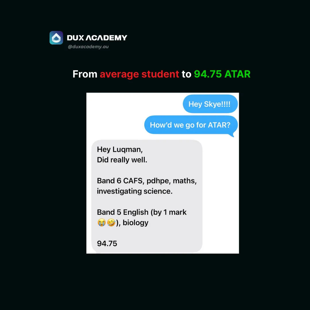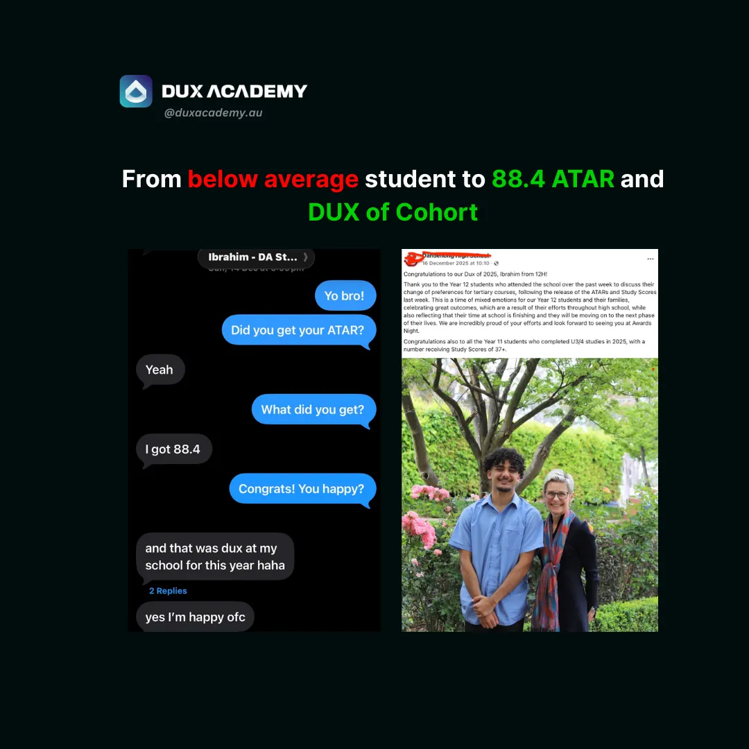 DUX Academy is your step-by-step blueprint that covers EVERYTHING you need to make the greatest academic comeback and achieve a 95+ ATAR - regardless of your current grades, school you go to or the subjects you've chosen.
